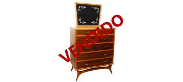 CÔMODA FOLEADA EM IMBUIA / DÉCADA 50 / PUXADORES ORIGINAIS EM FERRO ESCOVADO DOURADO / ESPELHO JATEADO ANTIGO ORIGINAL DIMENSÕES: 0,92 COMP /0,50 PROF /1,10 ALTURA (sem o espelho ) 1,66 ALTURARead More…